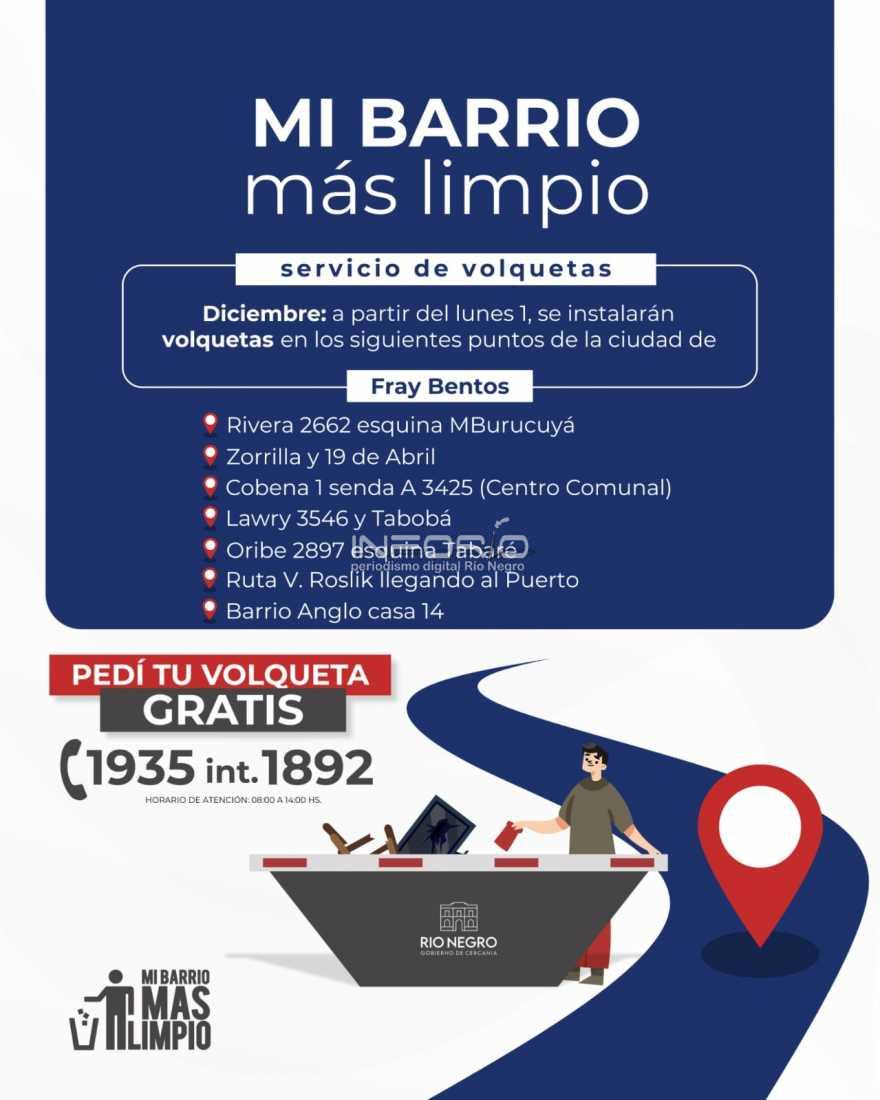La Intendencia de Río Negro informa que se encuentran instaladas nuevas volquetas en diferentes puntos de la ciudad de Fray Bentos, con el objetivo de mejorar la gestión de residuos y fortalecer la limpieza urbana.