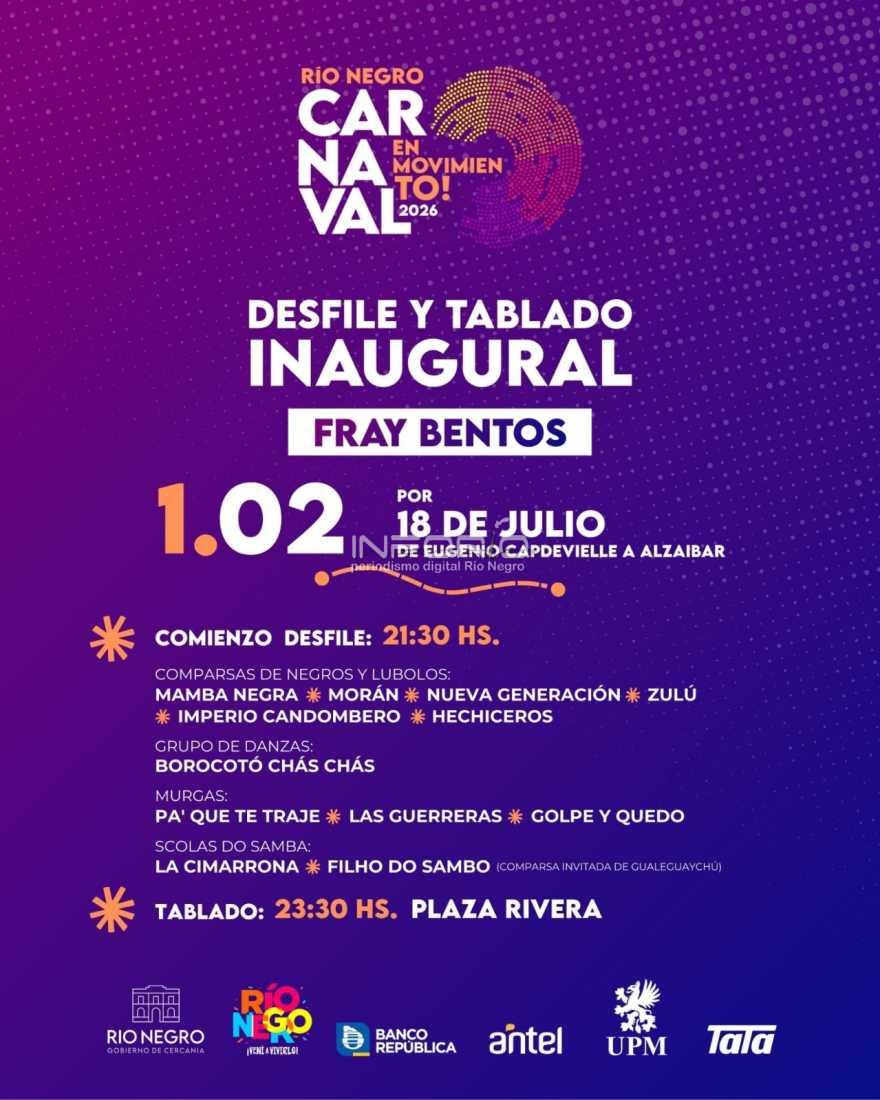 En el marco de la propuesta “Río Negro, vení a vivirlo”, del 5 al 8 de febrero se desarrollará en la ciudad de Fray Bentos el Concurso Regional de Murgas 2026.El evento tendrá lugar en el Teatro de Verano, sobre el escenario que este año llevará el nombre “Longa Márquez&rdquo...