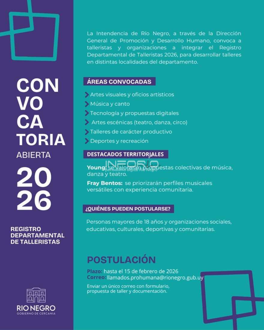 La Intendencia de Río Negro, a través de la Dirección General de Promoción y Desarrollo Humano, abre la convocatoria pública para integrar el Registro Departamental de Talleristas 2026, destinada a personas mayores de 18 años con residencia comprobable en el departamento, interesadas en desarrollar talle...