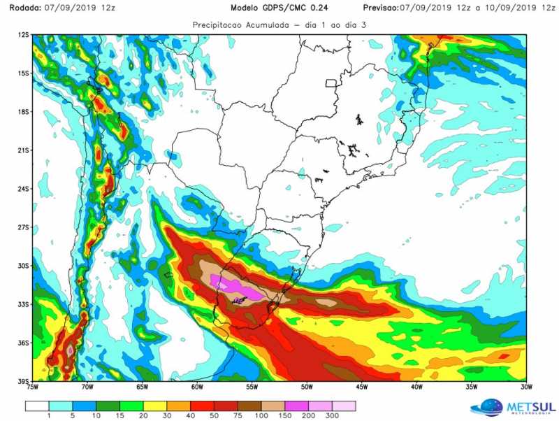 La empresa brasileña Metsul anuncia la posibilidad de "episodios de intensa inestabilidad para los próximos días, que traería volúmenes muy altos de lluvia para partes del Río Grande del Sur y Uruguay".