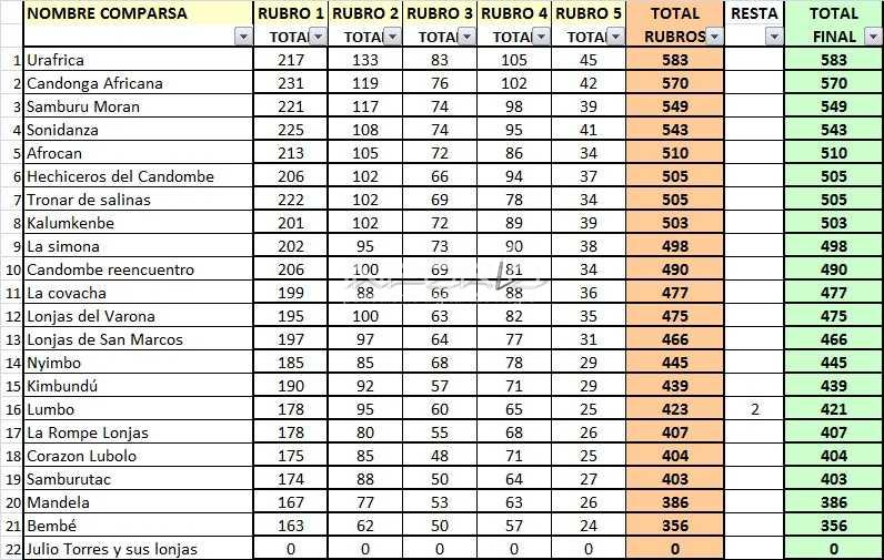 Las otras comparsas del departamento terminaron entre las 10 primeras de un total de 22 participantes. Hechiceros del Candombe terminaron en la sexta ubicación con 549 puntos y La Simona terminó en la novena ubicación con 498 puntos.