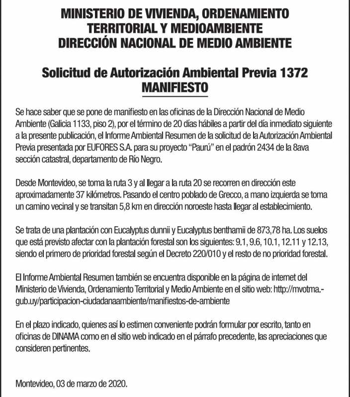 Se hace saber que se pone de manifiesto en las oficinas de la Dirección Nacional de Medio Ambiente (Galicia 1133, piso 2), por el término de 20 días hábiles a partir del día inmediato siguiente a la presente publicación, el Informe Ambiental Resumen de la solicitud de la Autorización Ambiental Previa presentada por EUFORES S.A. para su proyecto “Paurú” en el padrón 2434 de la 8ava sección catastral, departamento de Río Negro.