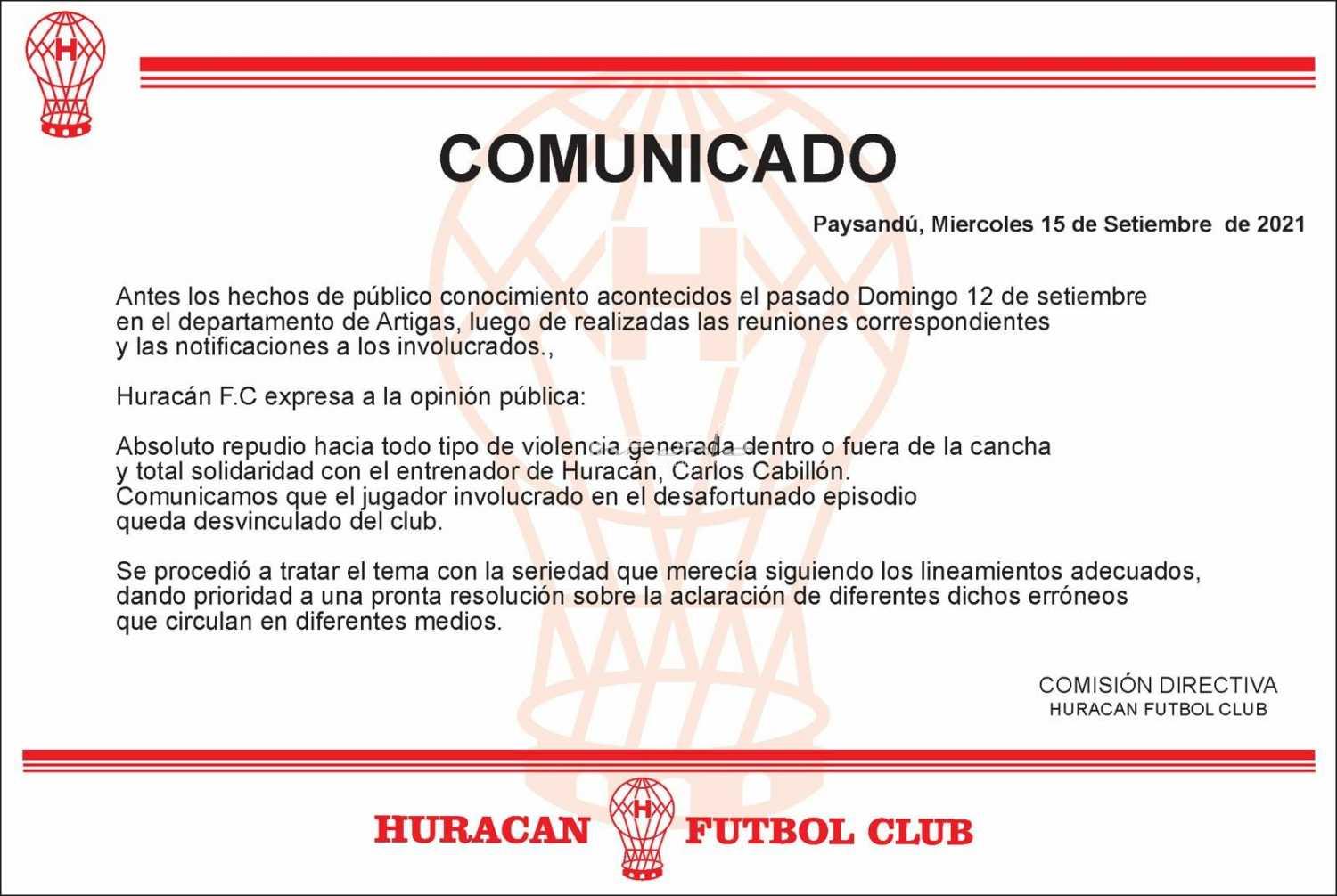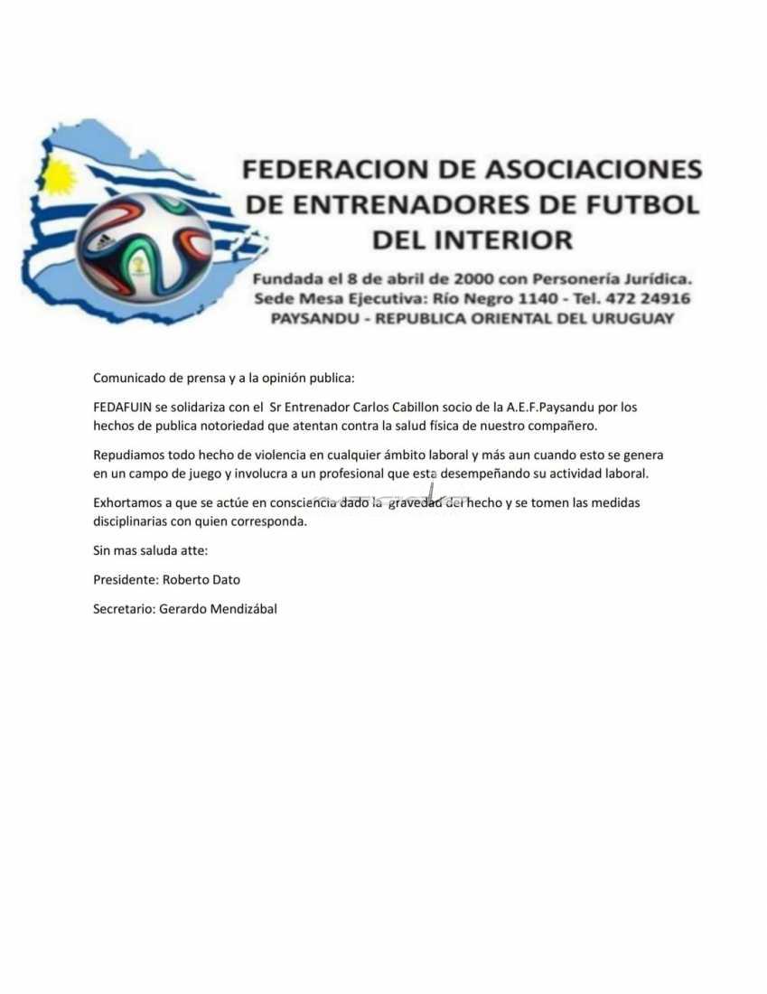 Quiero agradecer a todos los Entrenadores del interior que se comunicaron conmigo. A lo primero dije que de no seguir más , después pensando digo que no por un violento tengo que abandonar a gente que quiere progresar"- Carlos Cabillon - DT Huracán de Paysandú.
