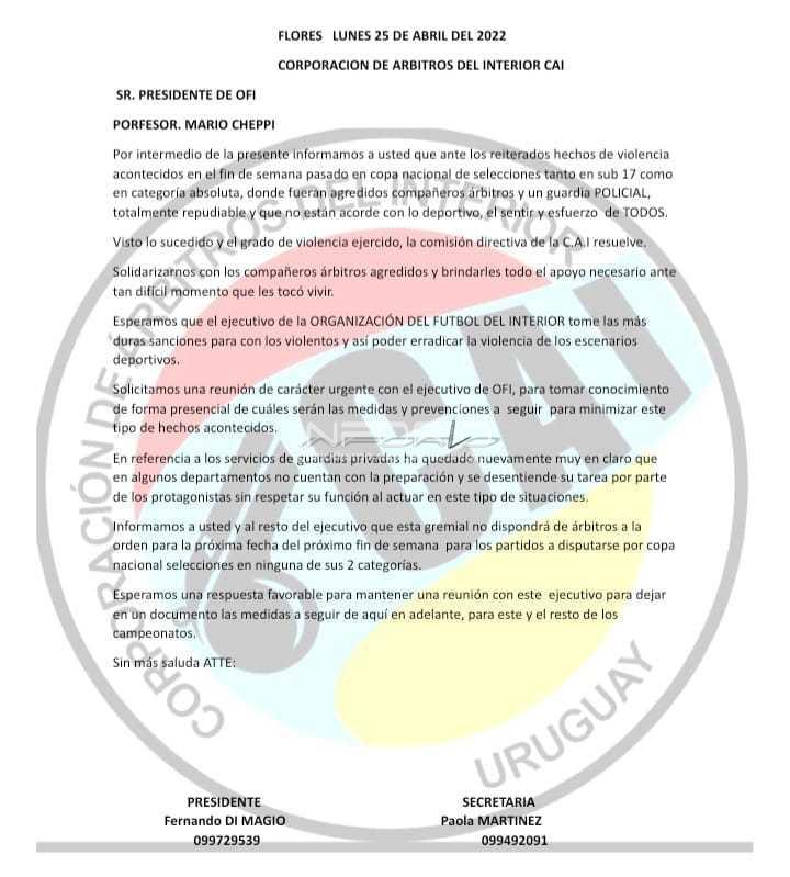 La Corporación de Arbitros del Interior (CAI), envió nota al Presidente de OFI Chieppi (en los mismos términos también envió nota la AIAF que es la otra Asociación de Arbitros), comunicandole que no habrá Arbitros disponibles para el próximo fin de semana, por la Copa Nacional de Selecciones en ambas categorías.