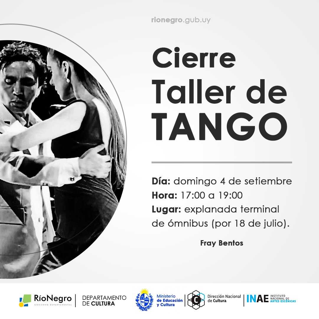 El Departamento de Cultura informa sobre el cierre del Taller de Tango. El mismo se realizará en la explanada de la terminal de ómnibus por la calle 18 de Julio y será a partir de las 17 horas hasta las 19 hs.