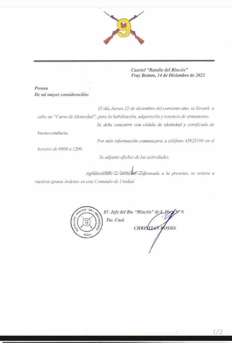 El Batallón de Infantería Mecanizada Nº 9 invita para el próximo jueves 22 de diciembre, a participar del Curso de Idoneidad en Manejo de Armas, para la habilitación, adquisición y tenencia de armamento. Se desarrollará de mañana y de tarde, en el Batallón Nº 9 (adjuntamos follletos).-
