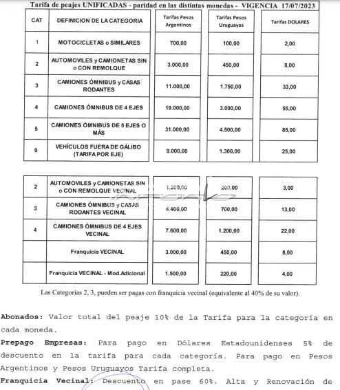 La Comisión Administradora del Río Uruguay comunica que a partir de las 00:01 hs. del día lunes 17 de Julio de 2023, se adecuan las tarifas, en pesos argentinos y uruguayos conforme al tipo de cambio de ambos países, de los peajes en el Puente Libertador Gral. San Martín (Fray Bentos-Gualeguaychú) y en el Puente General Artigas (Paysandú-Colón), ambos administrados por la CARU.