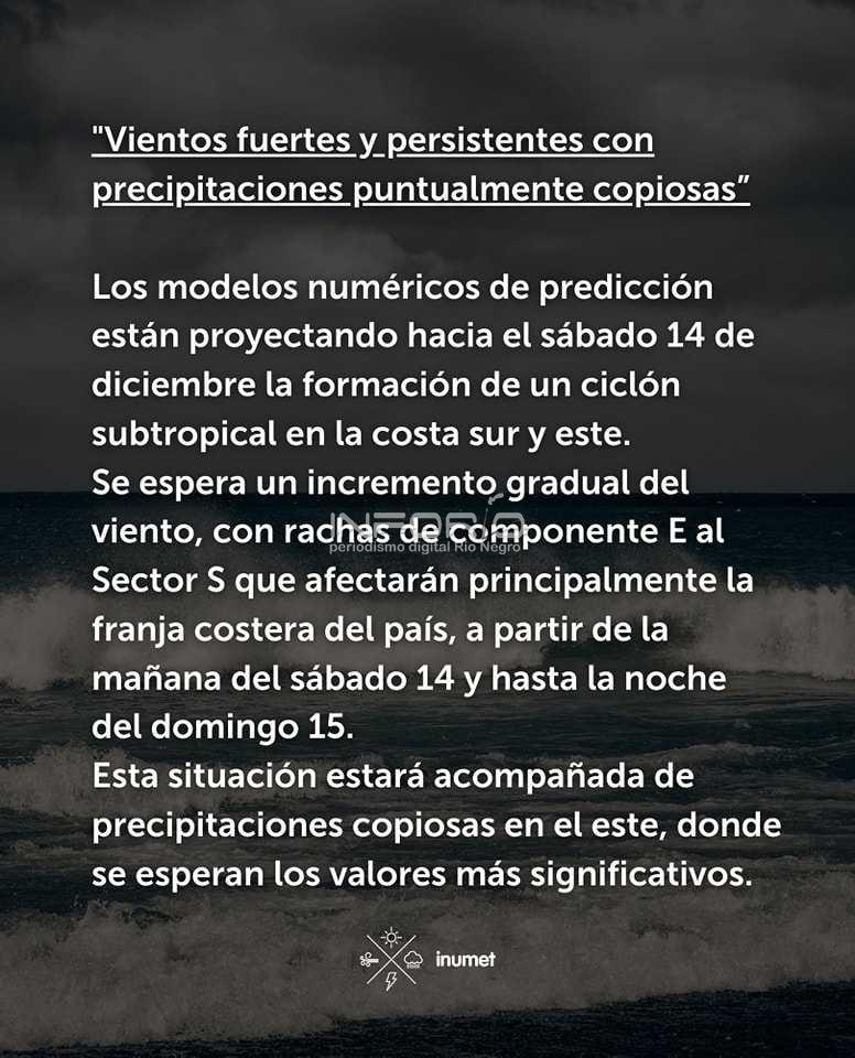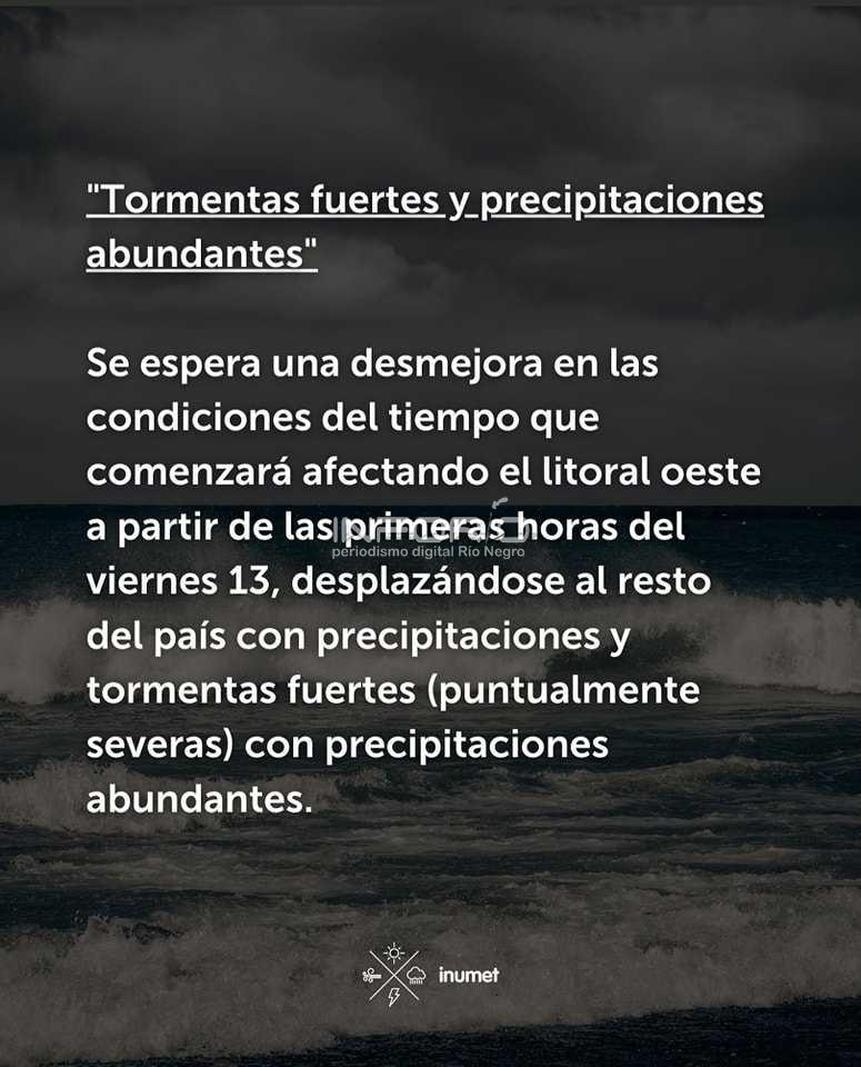 El Instituto Uruguayo de Meteorología es el organismo uruguayo encargado de prestar los servicios públicos meteorológicos y climatológicos. Elevó el siguiente informe para el dóa viernes, con advertencia por Tormentas Fuertes y Ciclón Extra Tropical ( ver fotos).-