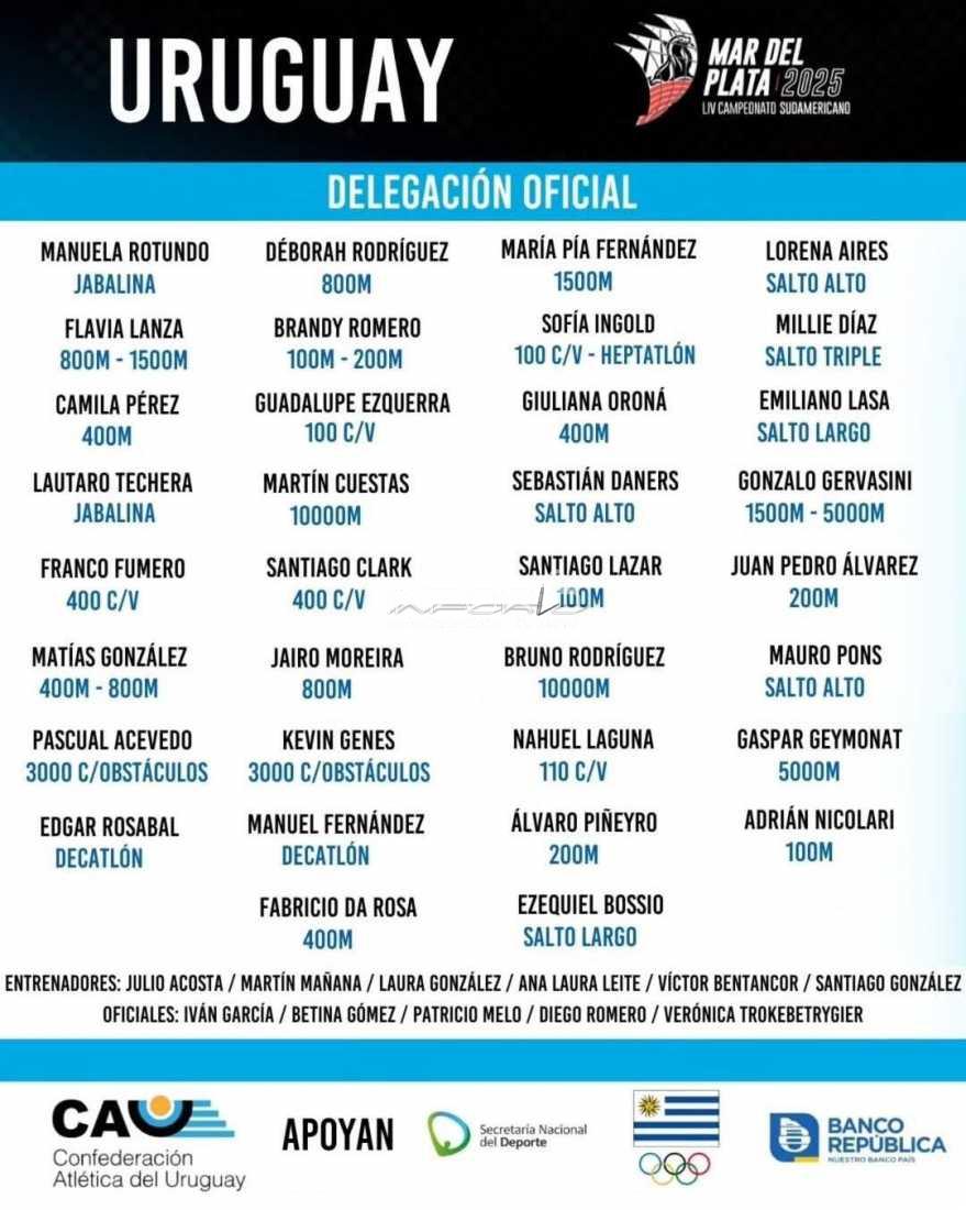 La nómina está conformada por 34 deportistas, encabezados por los olímpicos Emiliano Lasa (salto largo), Déborah Rodríguez (800 metros), María Pía Fernández (1500 metros) y Martín Cuestas (10.000 metros).