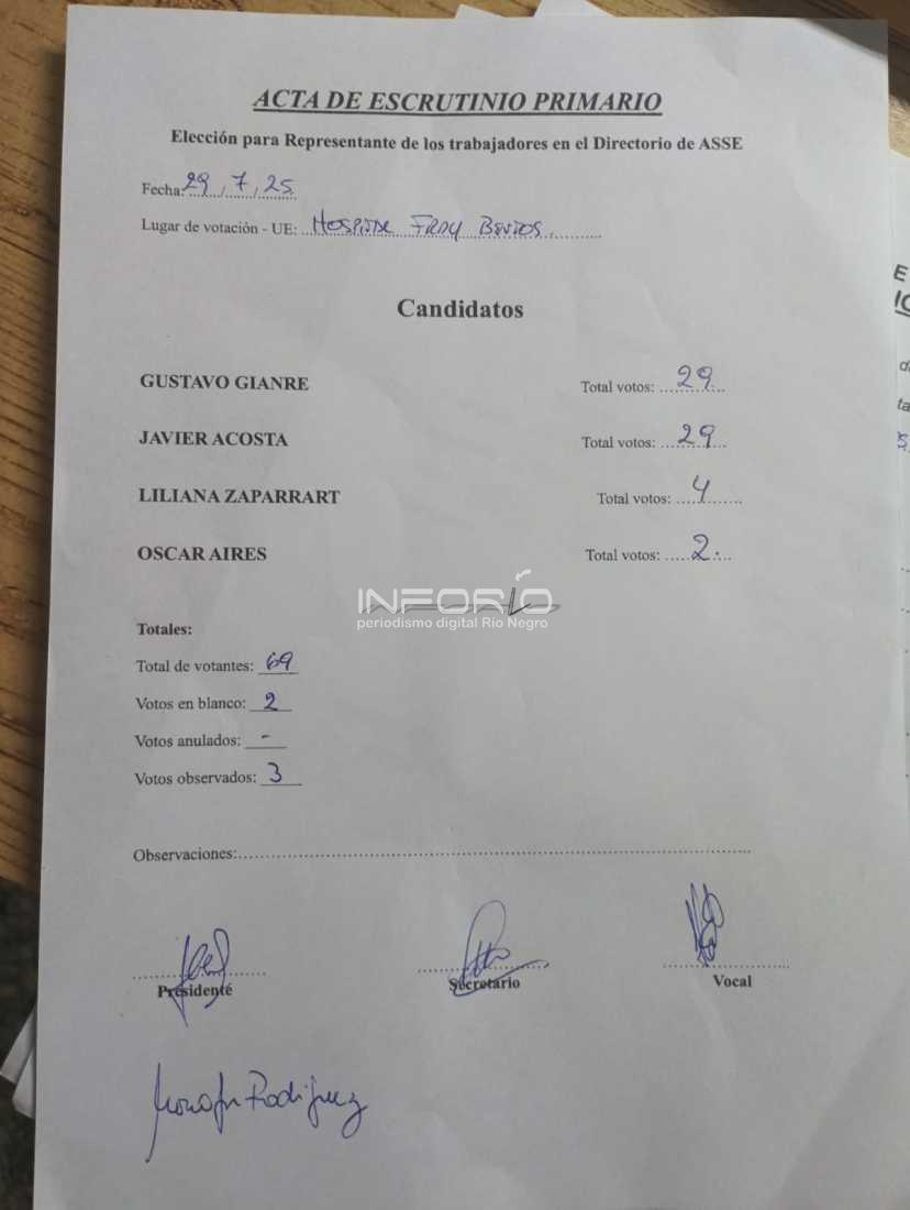 En la filial Fray Bentos, con mesa en el hospital local, de un total de 143 habilitados, votaron 69 afiliados, (50%), con 2 votos en blanco, sin anulados y 3 votos observados que a la postre definirán el ganador en lo local.