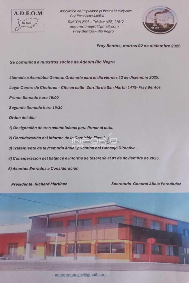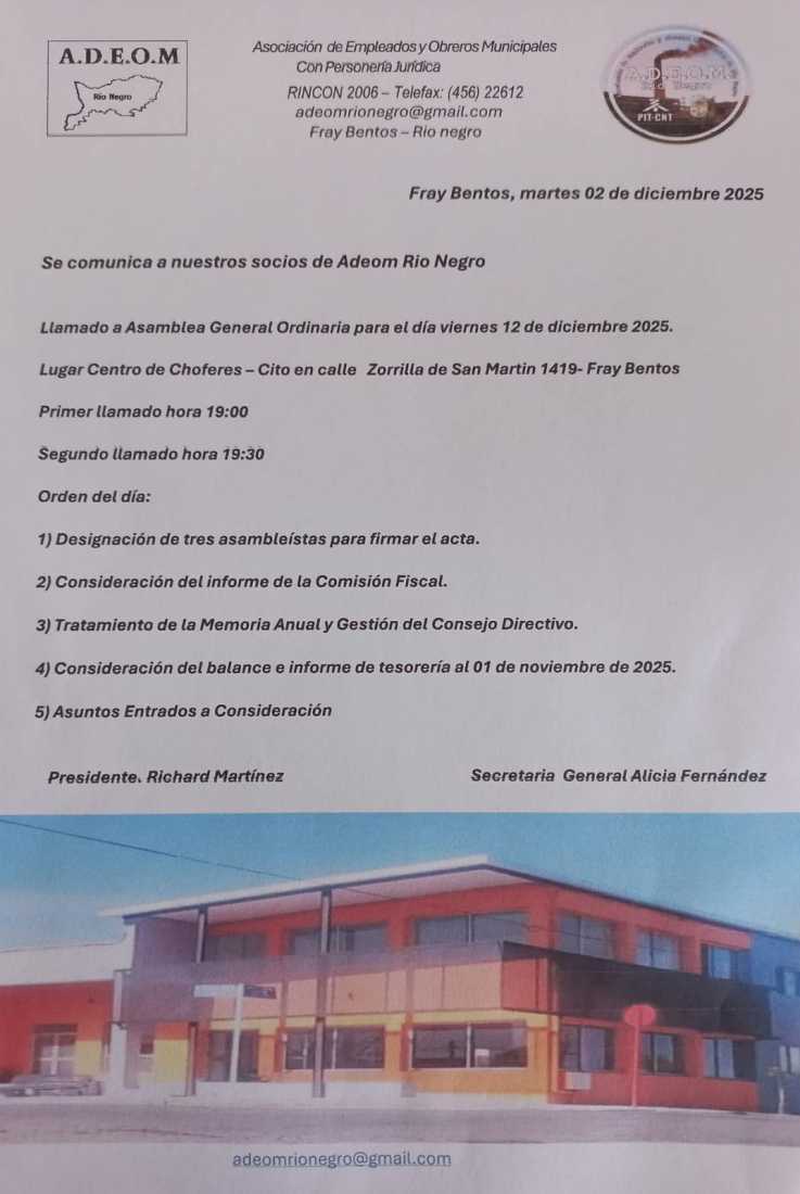 Con la convocatoria a asamblea general ordinaria, el viernes 12 de diciembre, a las 19.00 horas en el Centro de Protección de Chóferes, la comisión directiva de ADEOM, presidida por Richard Martínez, está cerrando el ejercicio 2025, con superávit, en el funcionamiento del sindicato de los municipales. Las condiciones del gremio son totalmente diferentes, en comparación con hace algunos años atrás, en las circunstancias que se encontraba el sindicato, pero hoy la situación es distinta, con una sede que es un ejemplo a nivel del país, con expectativas de seguir creciendo, con nuevos proyectos y emprendimientos que se van a dar a conocer a la brevedad. Dentro de los puntos que abordará la asamblea está, designación de tres asambleístas para la firma del acta, consideración del informe de la comisión fiscal, tratamiento de la memoria anual y gestión del consejo directivo, consideración del balance e informe de tesorería al 1º de noviembre de 2025 y asuntos entrados a consideración. A modo de adelanto el presidente de ADEOM, Richard Martínez, aseguró que se cierra un año muy favorable, con un importante superávit y proyecciones de futuro.