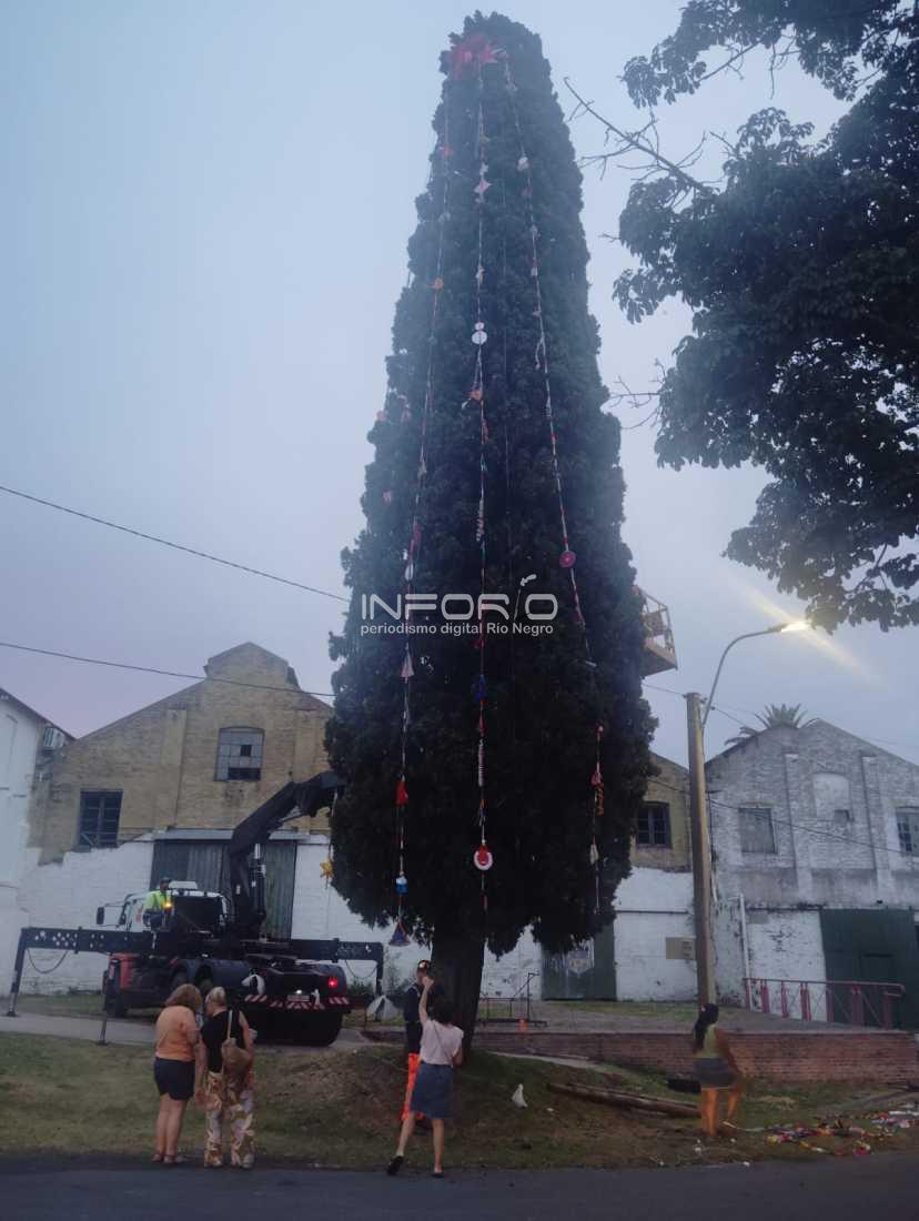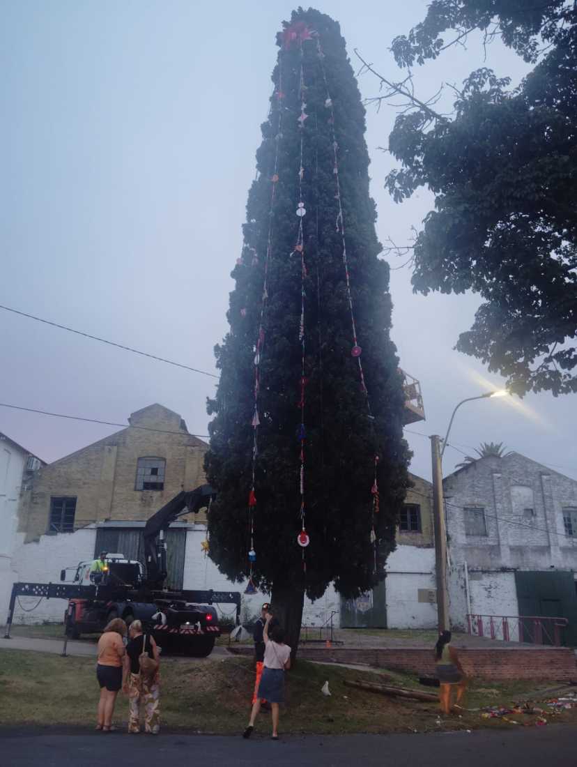 Con particular entusiasmo el movimiento encabezado por Sara Michelena, se dispuso decorar el pino de gran porte, ubicado frente al boliche bailable Fueloil, contando con el apoyo de la empresa Sanguinetti, que aportó la grúa y la presencia de seis operarios, que han dejado el alma en el montaje del árbol navideño. El pino mide 18 metros con 70 centímetros, por lo que va a requerir de una grúa de mayor altura, para dejar todo en condiciones y que se produzca el encendido del mismo, aunque ya las pruebas han resultado satisfactorias. Tiene la peculiaridad de los chirimbolos hechos en croché, en un gran trabajo del grupo tejiendo patrimonio. Esto refleja una pasión por brindarle a la comunidad algo diferente, de color, vida y de mostrarnos a todos nosotros, que no es una cuestión de plata, sino de ganas y optimismo, ante la proximidad de las fiestas tradicionales.