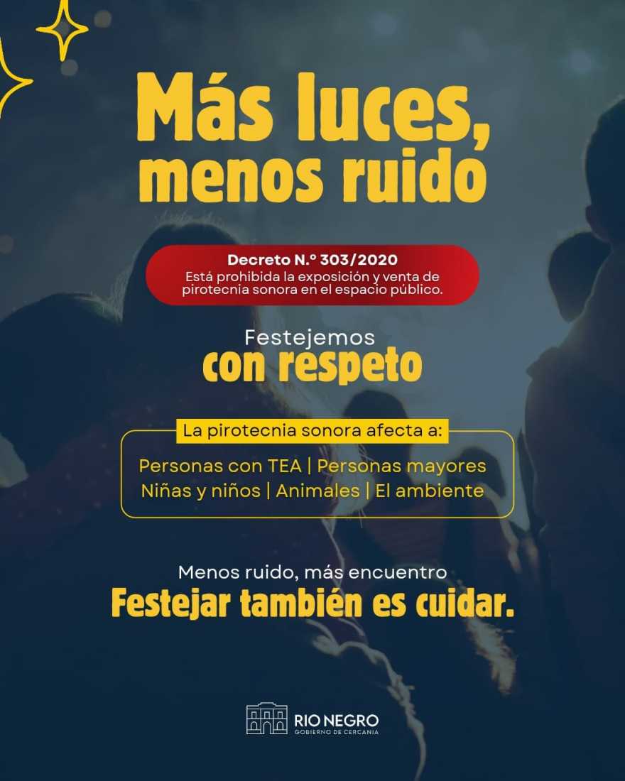 La Intendencia de Río Negro recuerda que se encuentra vigente el Decreto N.º 303/2020, aprobado por la Junta Departamental de Río Negro, que prohíbe la exposición y venta de pirotecnia sonora en el espacio público.