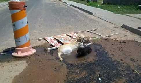 Hace un par de días Dahiana Capdevila compartió en su Facebook personal una imagen muy curiosa. Dos perros apaciguando su calor en un pozo con una rotura de un caño de agua en el medio de la calle.