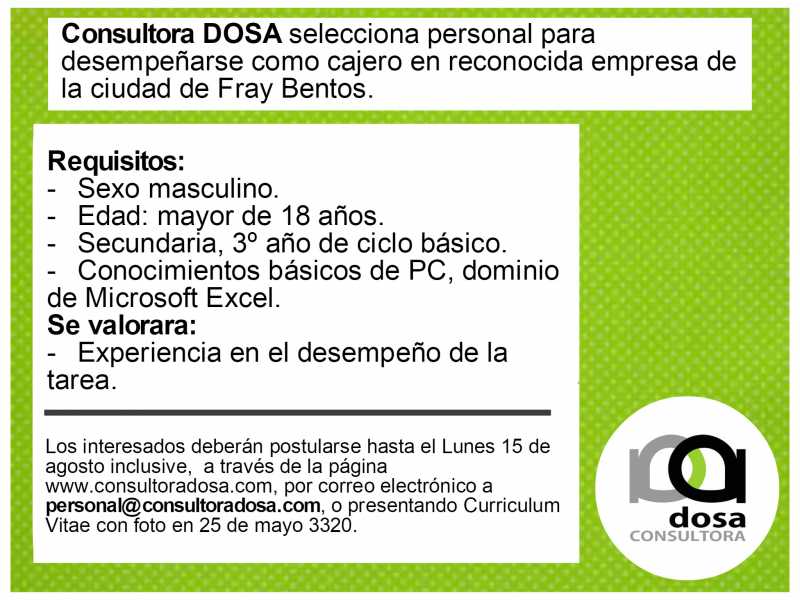 Consultora DOSA está realizando un llamado para seleccionar personal para una reconocida empresa del medio. En este caso es para desempeñarse como cajero en un comercio de Fray Bentos.