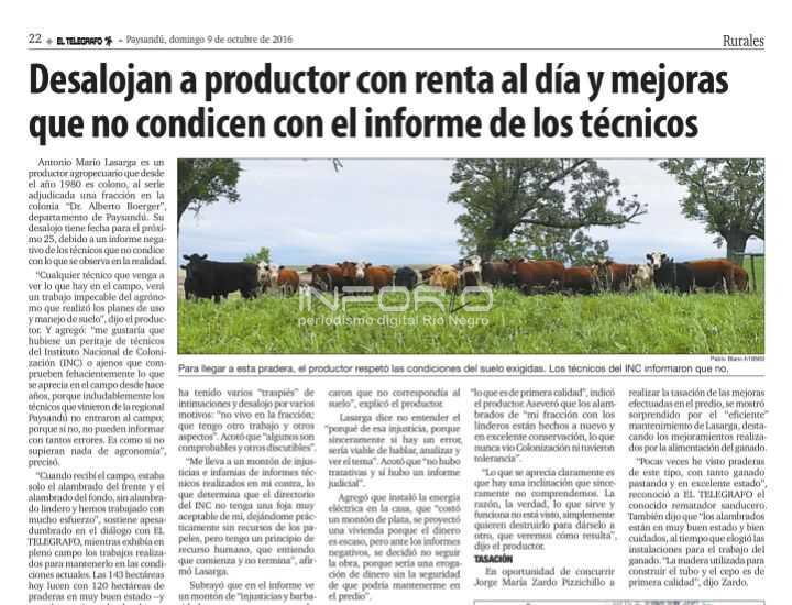 Antonio Mario Lasarga es un productor agropecuario que desde el año 1980 es colono, al serle adjudicada una fracción en la colonia “Dr. Alberto Boerger”, departamento de Paysandú. Su desalojo tiene fecha para el próximo 25, debido a un informe negativo de los técnicos que no condice con lo que se observa en la realidad.