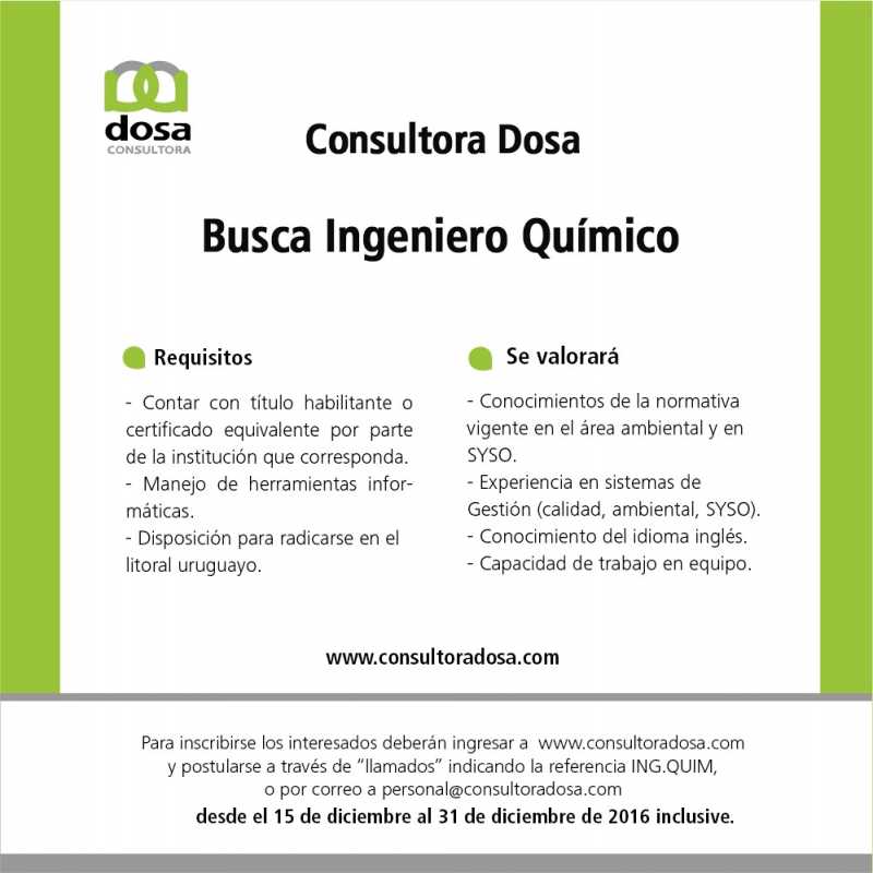 Consultora DOSA está realizando un llamado para ocupar un cargo de Ingeniero Químico en una empresa de la zona litoral del país.