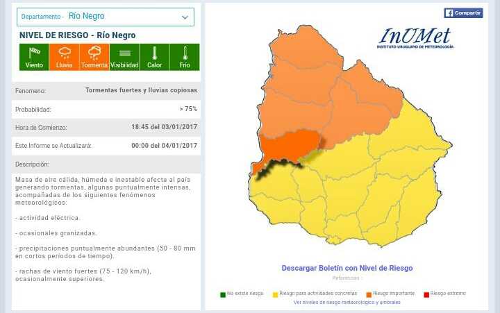 La advertencia rige para todos los departamentos al norte del río Negro. En tanto a sur el nivel de riesgo es amarillo.