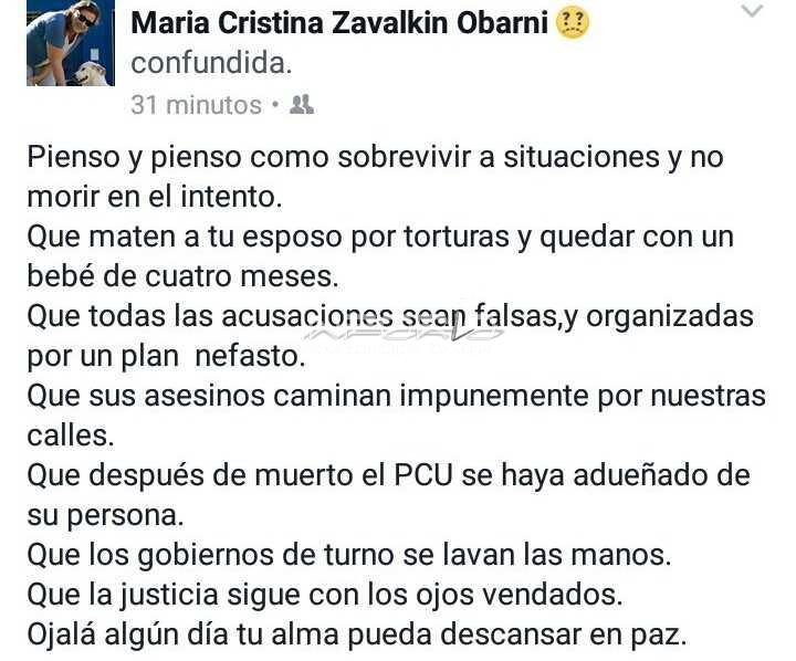 En la publicación expresó que "los asesinos caminan impunemente", que después de muerto el PCU se adueñó de su figura, y que "los gobiernos de turno se lavan las manos".