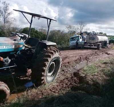 “Tiré los 2.000 litros porque no tenía otra opción”, dijo un apesadumbrado productor, que junto a otro vecino y utilizando el tractor de cada uno, tuvieron que ingeniársela para sacar el camión que estaba enterrado por el barro en el camino de la colonia Acquistapace, al que se ingresa por el kilómetro 379 de ruta 3.