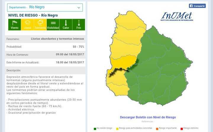 El INUMET emitió esta mañana una advertencia meteorológica de color amarillo para los departamentos de Artigas, Salto, Paysandú, Río Negro, Soriano, y Colonia por lluvias y tormentas.