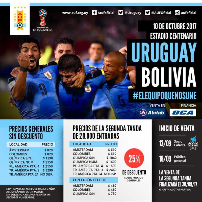La Asociación Uruguaya de Fútbol puso a la venta una primera partida de 15.000 entradas con descuentos, para el último partido de Uruguay en las Eliminatorias, el 10 de octubre ante Bolivia en el Estadio Centenario y se agotó rápidamente.