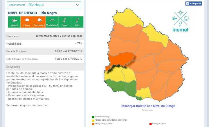 El INUMET emitió en más primeras horas de este martes un boletín con nivel de riesgo naranja para 11 departamentos, dentro de los cuales se encuentra Rio Negro.