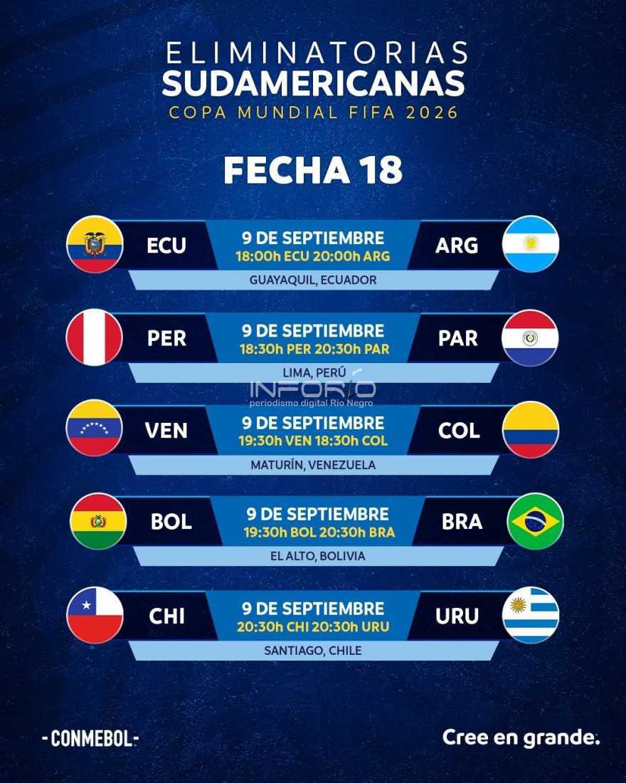 Se juega en forma íntegra todo el martes, la última fecha de las Eliminatorias, para el Mundial 2026 de Canadá, México y EEUU, con los 6 clasificados directamente.Hoy la Celeste enfrenta a Chile en tierras trasandinas (último en la Tabla y fuera totalmente del Mundial) a partir de las 20:30 horas.Colomb...