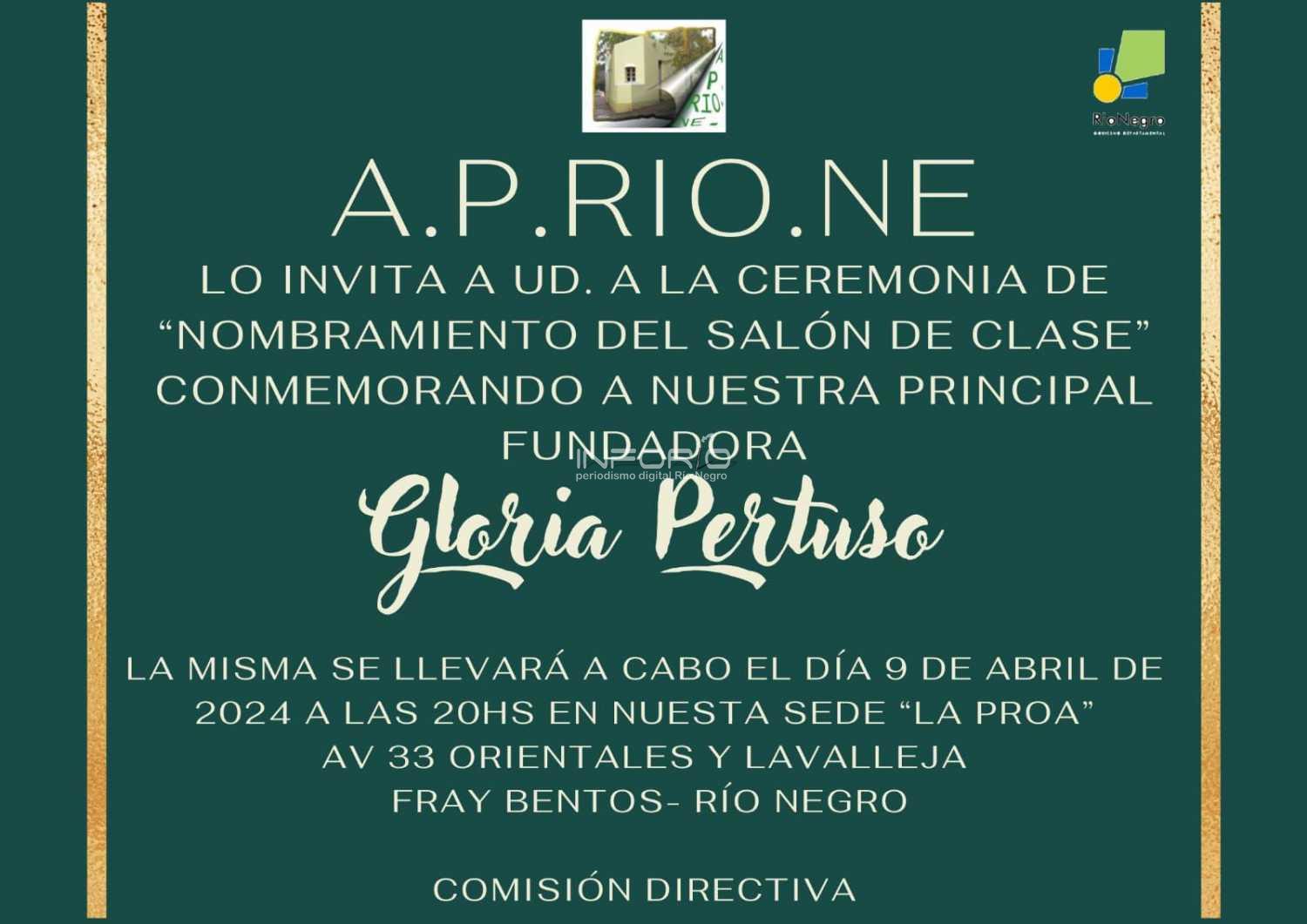 La Asociación de Plásticos de Río Negro está invitando a la población, a la ceremonia de nombramiento del salón de clase de su institución con el nombre de “Gloria Pertuso”.Se trata de un merecido reconocimiento y homenaje a una de sus principales fundadoras y colaboradora permanen...