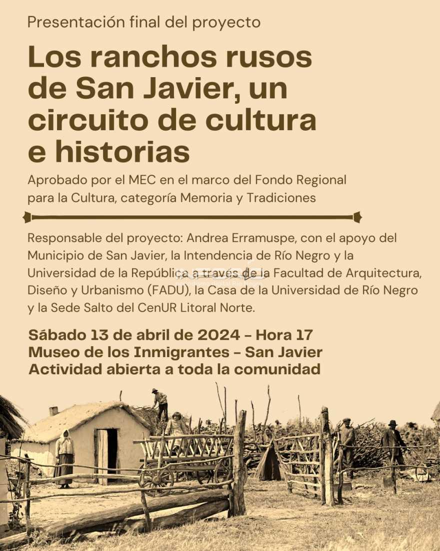 El sábado 13 de abril, a la hora 17.00, en el Museo de los Inmigrantes, en San Javier, se hará la presentación final del proyecto: “Los ranchos rusos de San Javier, un circuito de cultura e historias”.El mismo fue desarrollado por Andrea Erramuspe con el apoyo del Municipio de San Javier, la Intendencia de R&...