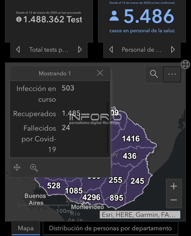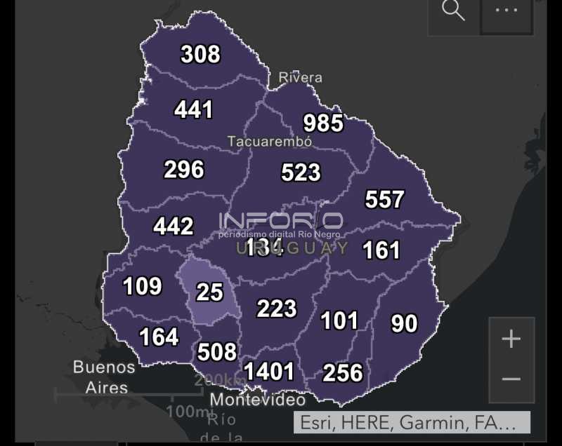 Coronavirus COVID-19. De los 1698 casos nuevos, 836 son de Montevideo, 125 de Canelones, 119 de Cerro Largo, 110 de Rivera, 80 de Río Negro, 74 d...