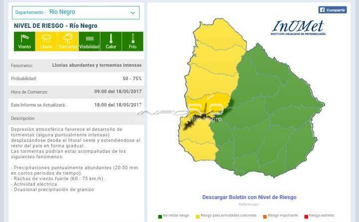 El INUMET emitió esta mañana una advertencia meteorológica de color amarillo para los departamentos de Artigas, Salto, Paysandú, Río Negro, Soriano, y Colonia por lluvias y tormentas. La advertencia rige desde las 9 de la mañana y se actualizará a las 18hs. Se anuncia la probabilidad...