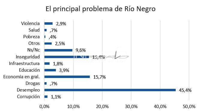 En el caso de Río Negro surgen valores menores que en otros en cuanto al desempleo pero surge casi en iguales niveles que la inseguridad el tema de los “problemas de la economía en general”. El desempleo es señalado como el principal problema del departamento por más del 45,4% de los entrevistados. En algunos de los municipios estudiados, este problema fue señalado por más del 50% de sus habitantes como el principal que tiene el departamento. El problema de la inseguridad es señalado como el más importante por un 15,4% de los habitantes del departamento, y obtiene casi el mismo registro que aquellos que señalan a temas de la “Economía en general” como el principal problema del departamento.