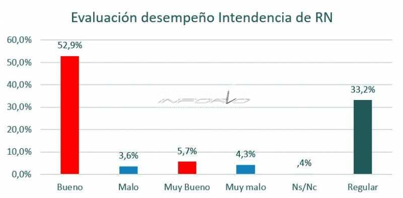 En lo que hace a la evaluación que realizan los ciudadanos de Río Negro del funcionamiento de la Intendencia Departamental en el total del departamento existe un total de habitantes que evalúan como buena y muy buena la gestión de la intendencia del orden del 57%. En el otro polo tenemos a quienes la evalúan como mala y muy mala, estos son el 8% de los entrevistados. El tercer grupo es el de aquellos que consideran que el accionar de la Intendencia es de Regular (es decir ni buena ni mala), estos son el 33% de los entrevistados.