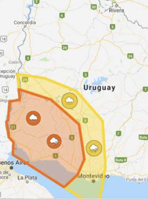 El Instituto Uruguayo de Meteorología (Inumet) emitió esta noche una advertencia amarilla y otra naranja por tormentas fuertes y lluvias intensas para varios departamentos del país. El pronóstico se mantiene vigente hasta las 23:00 horas de hoy.