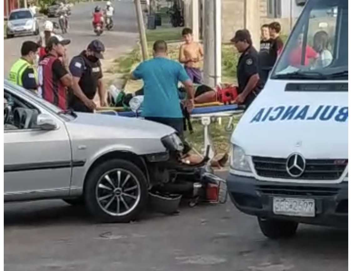 Hora 19:40 se recibe comunicación sobre un accidente de tránsito en calle Crotoggini y Oribe. Una vez el lugar se entrevista a C.F.M. U/S/ 41 años de edad, domiciliado en la ciudad, quien manifiesta que venia circulando en auto matricula del departamento, de norte a sur por calle Crottoggini y al llegar a la intersección con calle Oribe entra en colisión con una moto sin mas datos, conducida por J.B.M., U/S/27 años de edad, que llevaba como acompañante a K.LL.G., U/S/23 años de edad, los cuales venían de oeste a este, y a raíz del impacto ambos caen al pavimento sufriendo lesiones graves en brazos y piernas, concurriendo ambulancia y personal médico quienes trasladan a los mismo para su mejor atención.