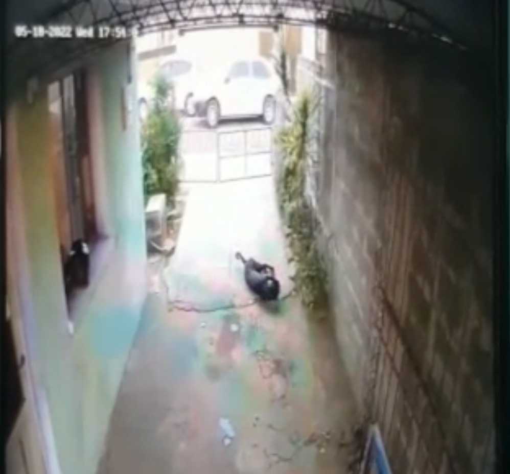 Según se desprende del video aportado a la policía y que se hizo viral por redes sociales, al salir al patio con intenciones de irse, se le acerca al perro. Instantes después el animal muere.