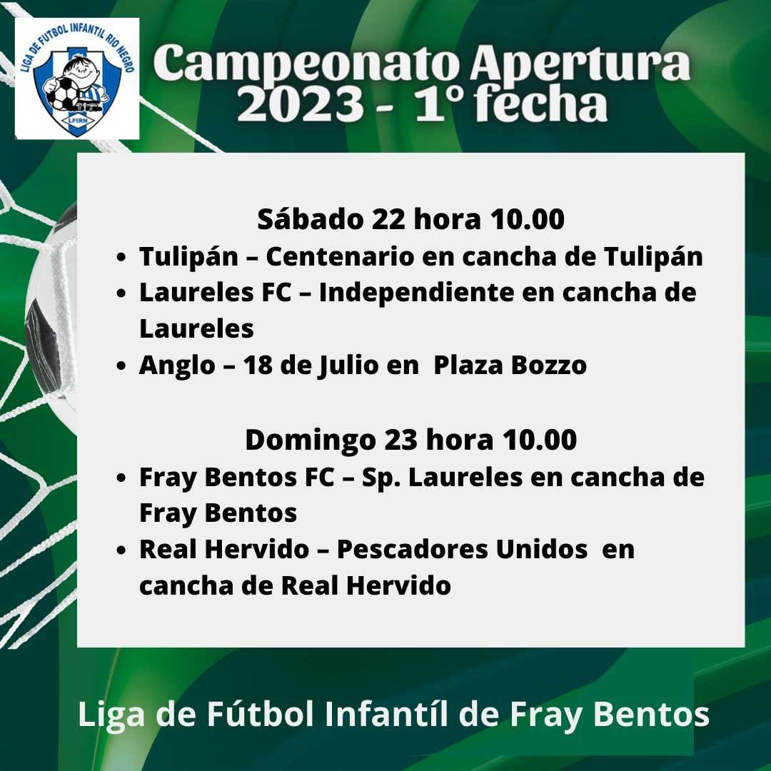 Entre sábado y domingo se juega la primera fecha del Torneo Apertura de la Liga de Fútbol Infantil de Fray Bentos. En 5 canchas se jugarán los partidos de este fin de semana, cancha dd Tulipán, cancha de Independiente, Estadio Infantil, canchas de Real Hervido y de Fray Bentos.