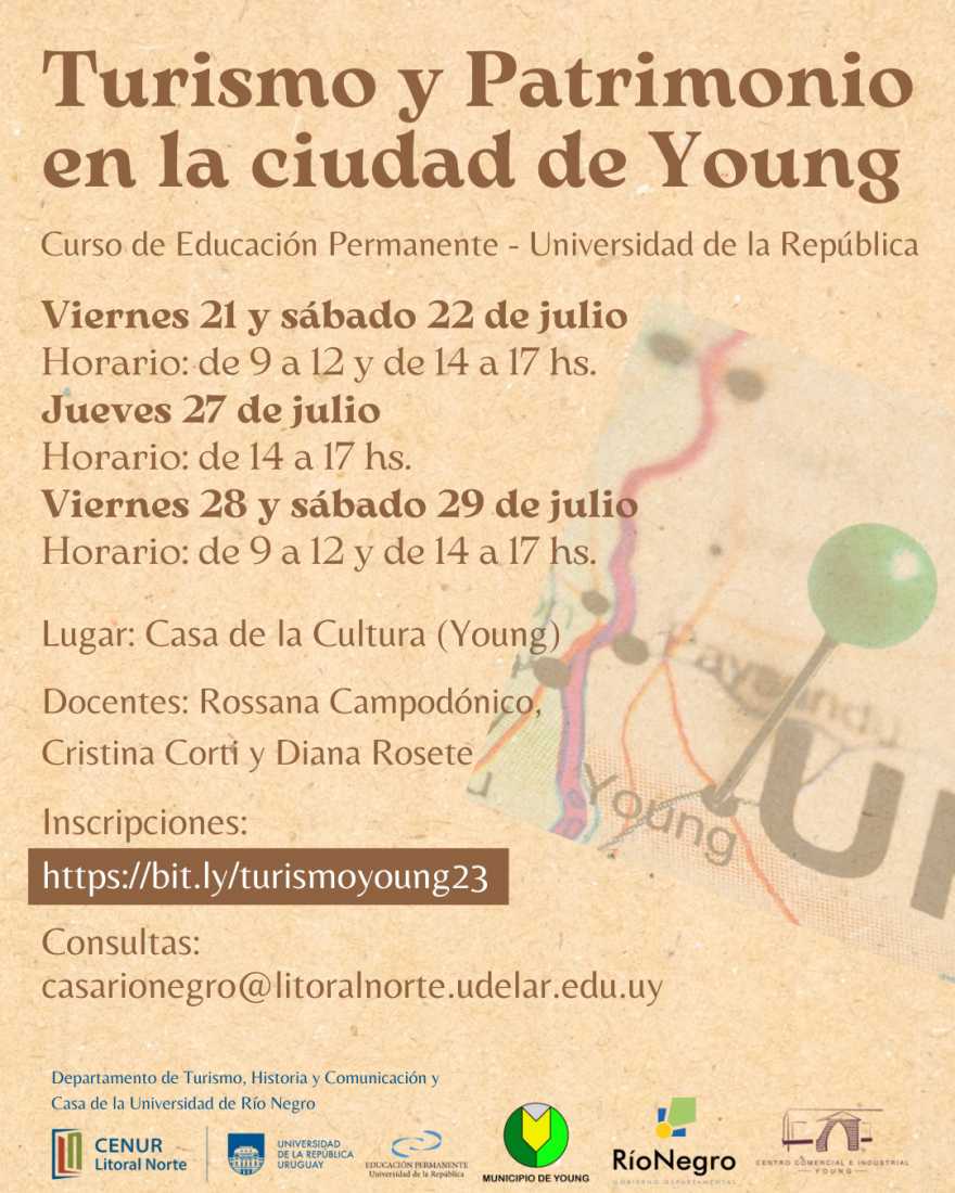 Continúa hoy viernes 28 y culmina mañana sábado 29 de julio, de 9.00 a 12.00 horas y de 14.00 a 17.00 horas, en la Casa de la Cultura de Young, el curso “Turismo y Patrimonio en la ciudad de Young”.