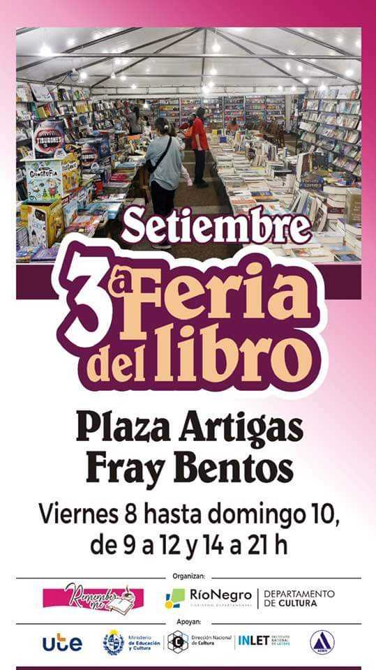 Se invita a los escritores rionegrenses y público en general a participar de la tercera edición de la Feria del Libro 2023 que se desarrollará en la plaza Artigas de Fray Bentos, desde el viernes 8 hasta el domingo 10 de setiembre próximo, en el horario de 9 a 12 y de 14 a 21 horas.