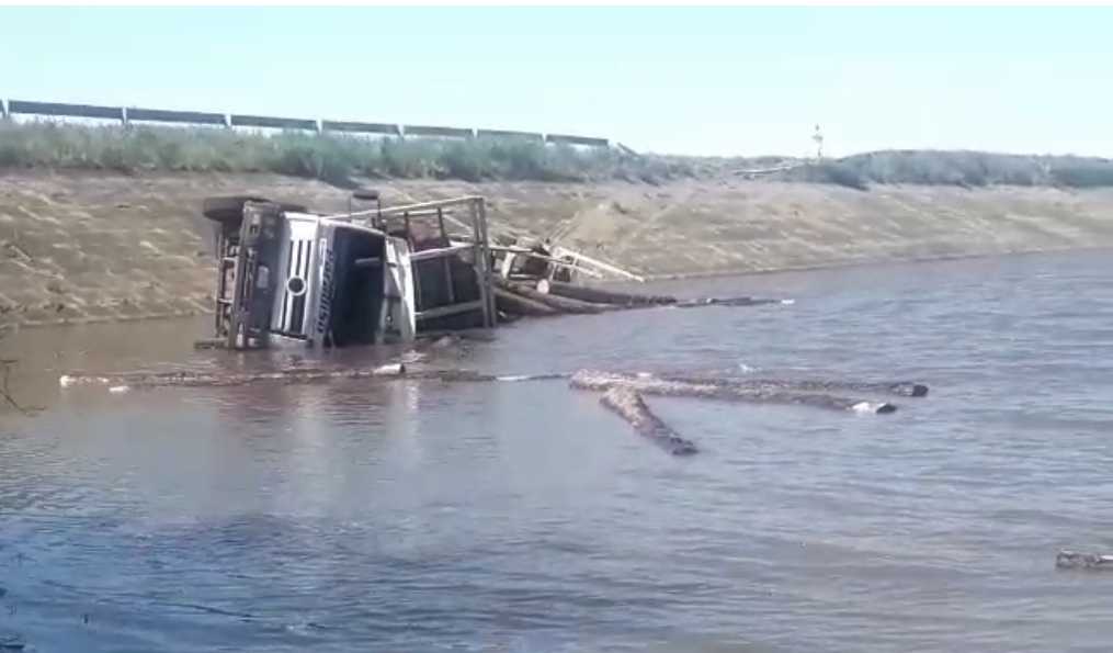 Por causas que se tratan de establecer, el camión cargado con rolos de madera, cayó del puente sobre arroyo Grande.