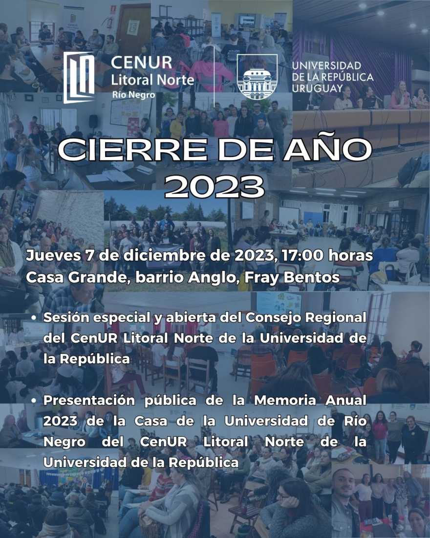 Con una actividad presencial en la Casa Grande (ubicada en el barrio Anglo) de Fray Bentos, el jueves 7 de diciembre, desde la hora 17.00, se realizará el cierre del año 2023 de la Casa de la Universidad de Río Negro.