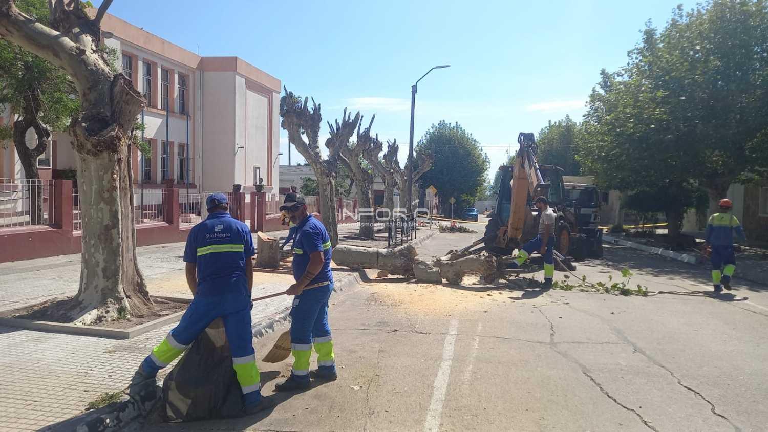 FINAL DE LA HISTORIA, PODA DE PLATANOS E HIDROLAVADORA. La preocupación de integrantes de la comunidad educativa de escuela 1, finalizó con una inmediata intervencion de personal municipal. En la mañana de este viernes y con miras al comienzo de los cursos el proximo lunes, se realizó una poda profunda de los árboles y se planifica el recambio del ornato publico, evaluando la especie a plantar en la vereda del centro educativo.