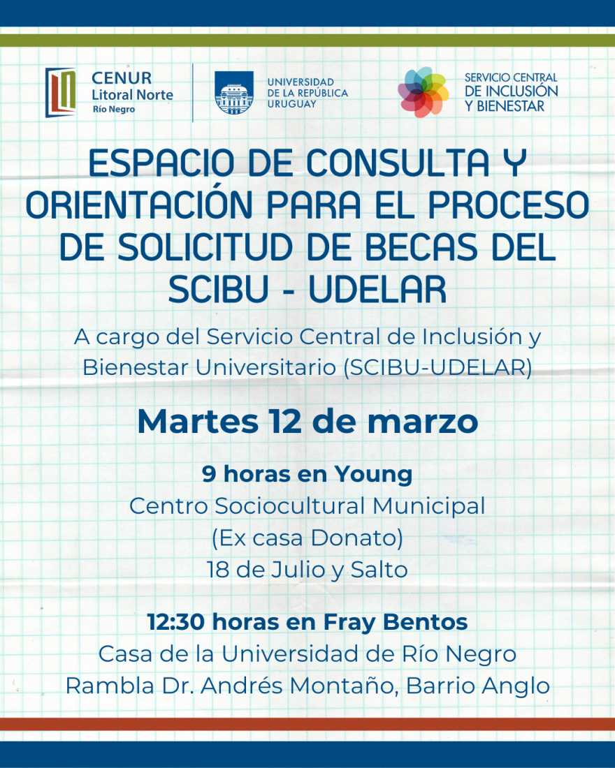 La Casa de la Universidad de la República de Río Negro invita, especialmente a estudiantes de la UDELAR, a una actividad denominada: “Espacio de consulta y orientación para el proceso de solicitud de becas del SCIBU- UDELAR”.