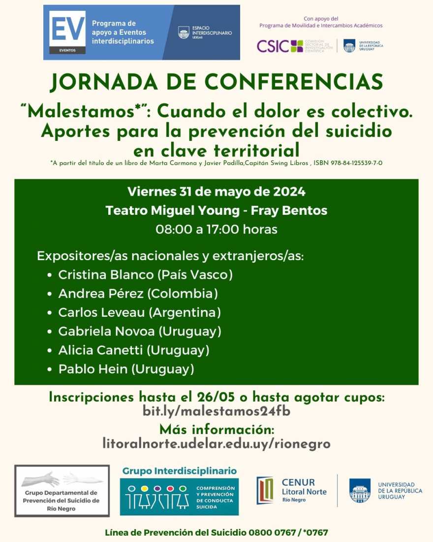 El viernes 31 de mayo se realizará en Fray Bentos una serie de conferencias sobre: “Aportes para la prevención del suicidio en clave territorial”.