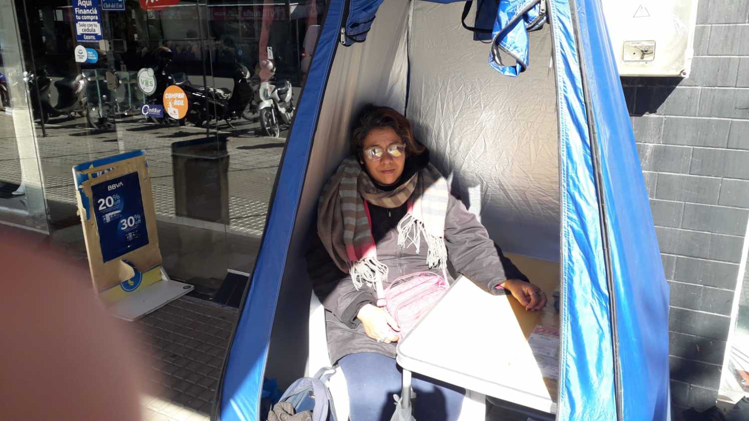 Últimamente, la lluvia y el frío la tenían a maltraer, primero colocó una lona, pero igualmente la baja temperatura y el agua complicaban enormemente su trabajo; hace poco tiempo un familiar le consiguió una carpa tipo iglú y con ello, Natalia puede llevar adelante su trabajo sin que las inclemencias del tiempo la puedan afectar.