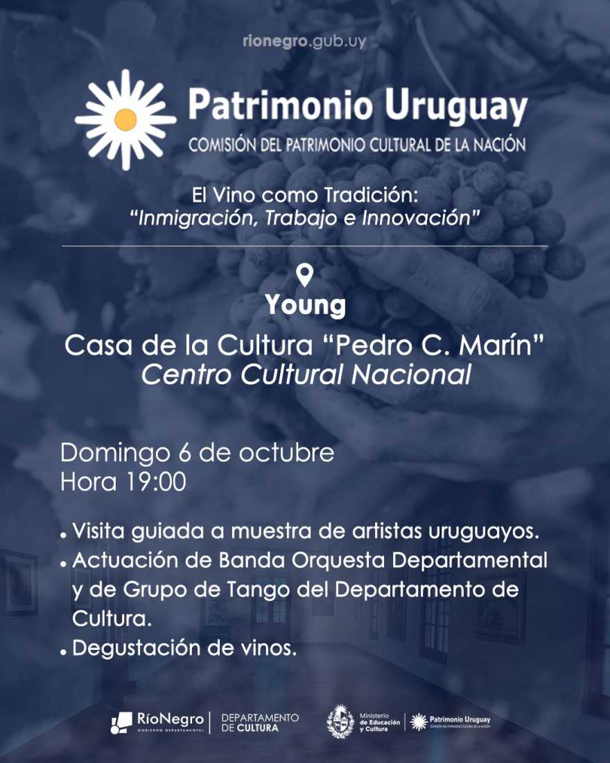 En el marco del tema elegido este año para celebrar el Día del Patrimonio: “El vino como tradición: Inmigración, Trabajo e Innovación”, en Young se ha planificado una actividad ha desarrollarse en la Casa de la Cultura “Pedro C. Marín”, Centro Cultural Nacional, en Young el domingo 6 a la hora 19.00.