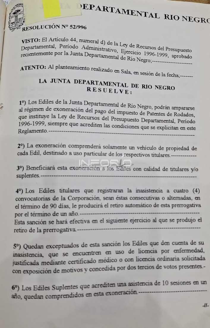 La iniciativa impulsada por un sector de la colectividad política y que alcanzó el apoyo de la bancada en pleno, busca trasladar la discusión al plenario en la sesión ordinaria del próximo 12 de setiembre. El edil del Partido Colorado, Cristian Rosas, expresó que la idea es seguir achicando los gastos para la administración departamental, por lo cual, impulsan eliminar la exoneración del pago de patente de rodados para los legisladores de la junta de Río Negro, del mismo modo que se hizo con la contribución inmobiliaria. Hay otros referentes de la comunidad que gozan de este beneficio, como jueces, fiscales, miembros del Poder Judicial, Jefe de Policía e integrantes de la junta electoral, los que se acogen a la aplicación del artículo 43 del presupuesto departamental en el inciso C y en el inciso D, que se intenta derogar ahora, es el que corresponde a los ediles, incluyendo a alcaldes y concejales de los municipios, entre otras autoridades de Río Negro. La propuesta no tiene que ver tanto por el monto que representa en materia de ahorro para la administración pública, sino como un gesto del cuerpo legislativo, de otras medidas que se vienen impulsando de futuro, cabe señalar que esta exoneración viene rigiendo desde 1996. El legislador colorado, Cristian Rosas, manifestó “no le podemos pedir al contribuyente que pague los aportes, que se aprete un poco el bolsillo y no hacerlo de todos lados”.