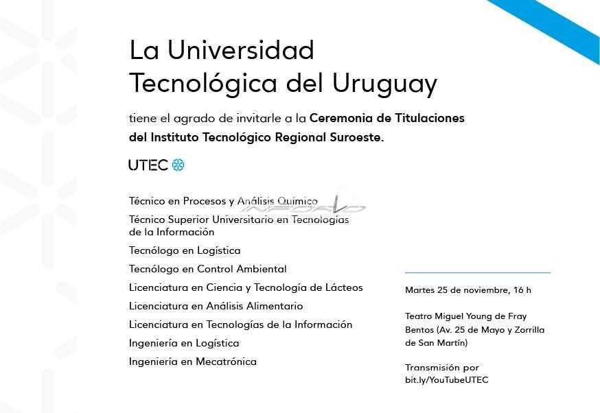 La Universidad Tegnológica del Uruguay y la Dirección General de Escuela Técnico Profesional, invitan a la Ceremonia de Titulaciones del Instituto Tegnológico Regional Suroeste, para el martes 25 de noviembre, a la hora 16.00 en el Teatro Miguel Young de la ciudad de Fray Bentos.