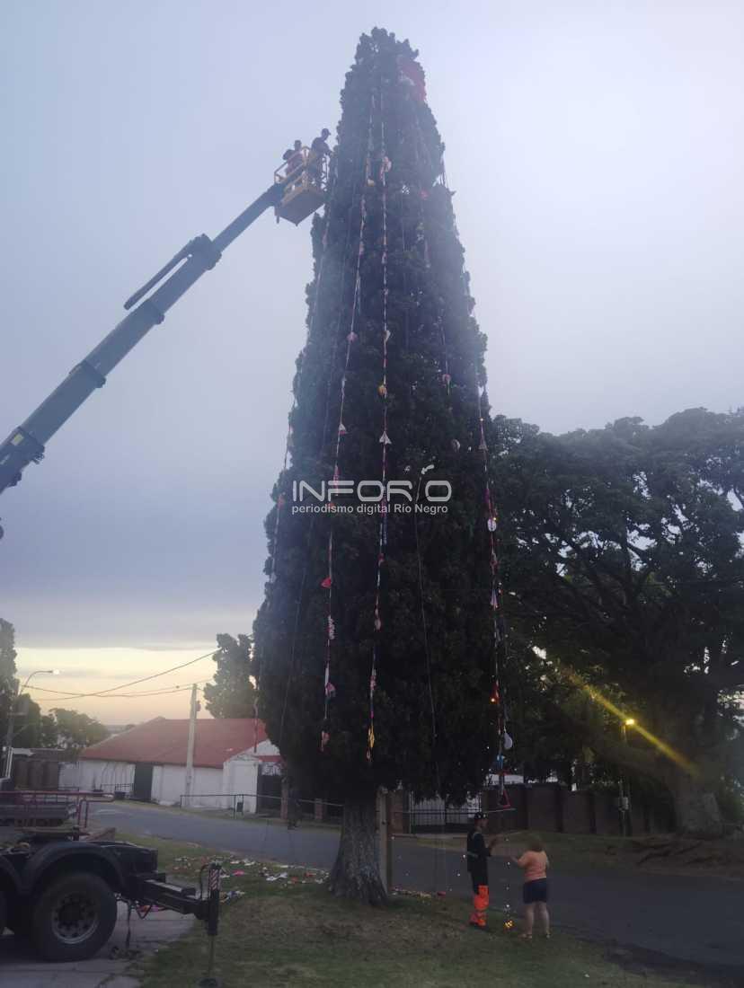 Con particular entusiasmo el movimiento encabezado por Sara Michelena, se dispuso decorar el pino de gran porte, ubicado frente al boliche bailable Fueloil, contando con el apoyo de la empresa Sanguinetti, que aportó la grúa y la presencia de seis operarios, que han dejado el alma en el montaje del árbol navideño. El pino mide 18 metros con 70 centímetros, por lo que va a requerir de una grúa de mayor altura, para dejar todo en condiciones y que se produzca el encendido del mismo, aunque ya las pruebas han resultado satisfactorias. Tiene la peculiaridad de los chirimbolos hechos en croché, en un gran trabajo del grupo tejiendo patrimonio. Esto refleja una pasión por brindarle a la comunidad algo diferente, de color, vida y de mostrarnos a todos nosotros, que no es una cuestión de plata, sino de ganas y optimismo, ante la proximidad de las fiestas tradicionales.